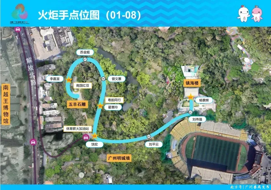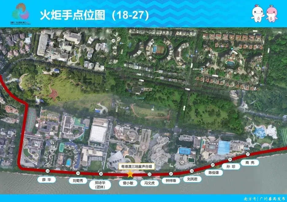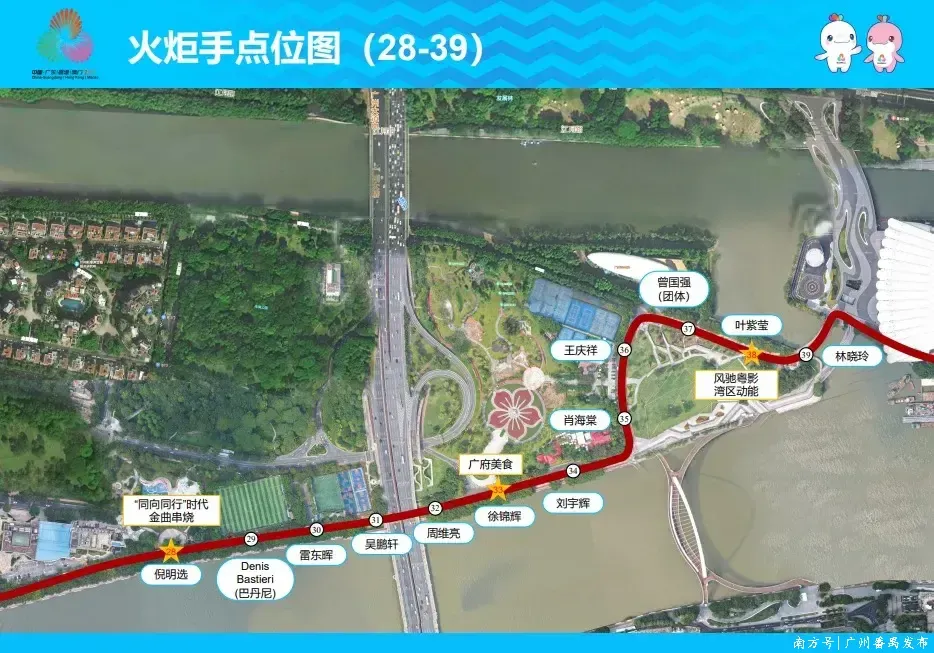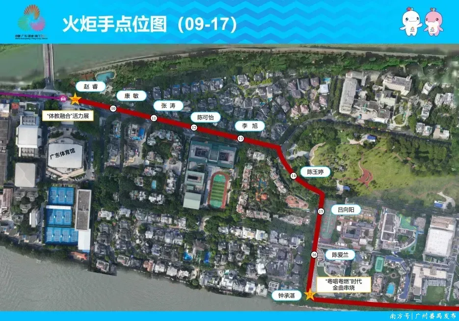 广东体育馆—星海音乐厅—广东美术馆—二沙岛体育公园—宏城公园—艺术公园—海心桥—海心沙亚运公园—星光大道—海心沙中心舞台(收火仪式)。