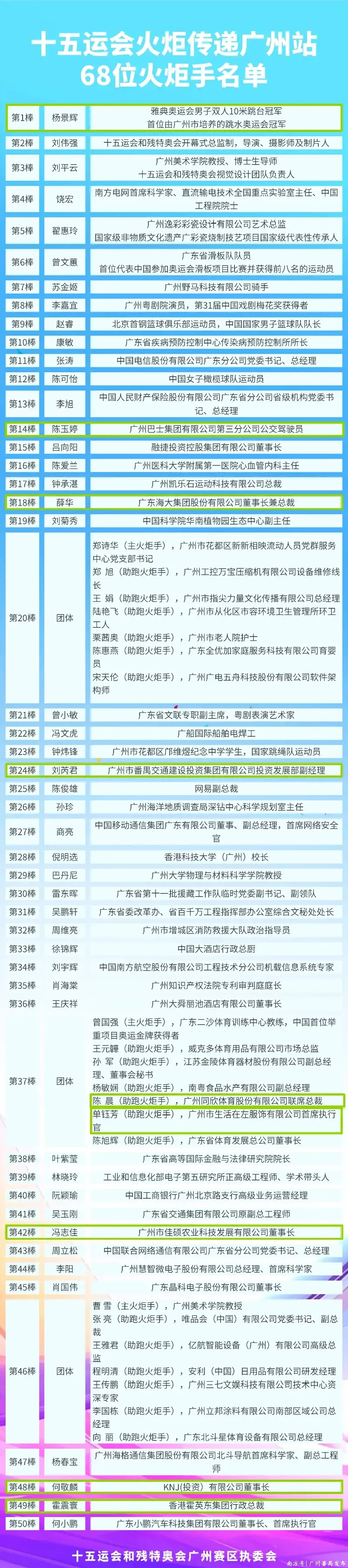 首位由广州市培养的跳水奥运会冠军杨景辉领衔68位火炬手。此外,来自体育界的火炬手,还有篮球运动员赵睿、滑板运动员曾文蕙、橄榄球运动员陈可怡、举重奥运冠军曾国强等。