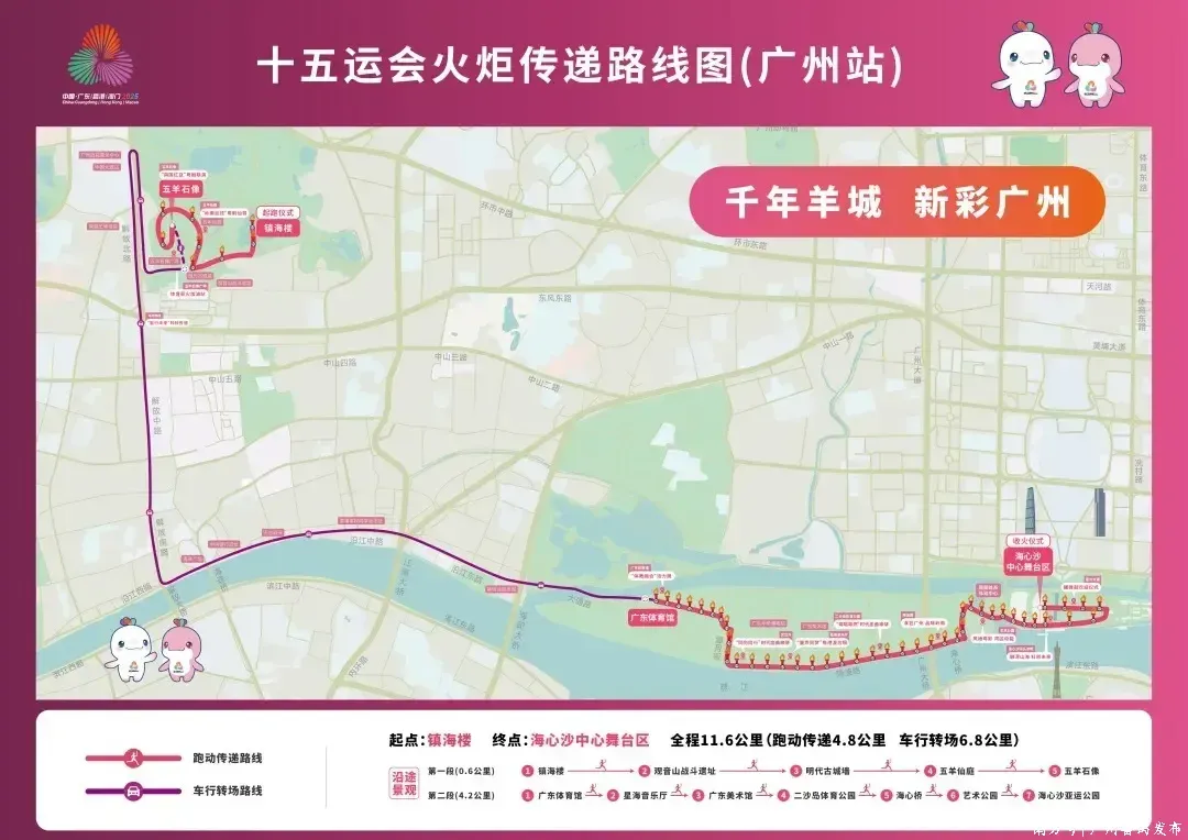 广州站十五运会广州赛区火炬传递路线以“千年羊城 新彩广州”为主题,从传统中轴迈向新中轴,从城市起源图腾(五羊石像)到近代历史印记(海珠广场),从体育冠军摇篮(广东省二沙体育训练中心)到城市客厅(海心沙中心舞台),串联历史地标与现代风貌,展开一段从古代文明到近代革命、再到现代都市的历史叙事,展现“老城市新活力”的传承与创新,彰显广州在融湾向海的中国式现代化进程中排头兵、领头羊和火车头的使命担当。