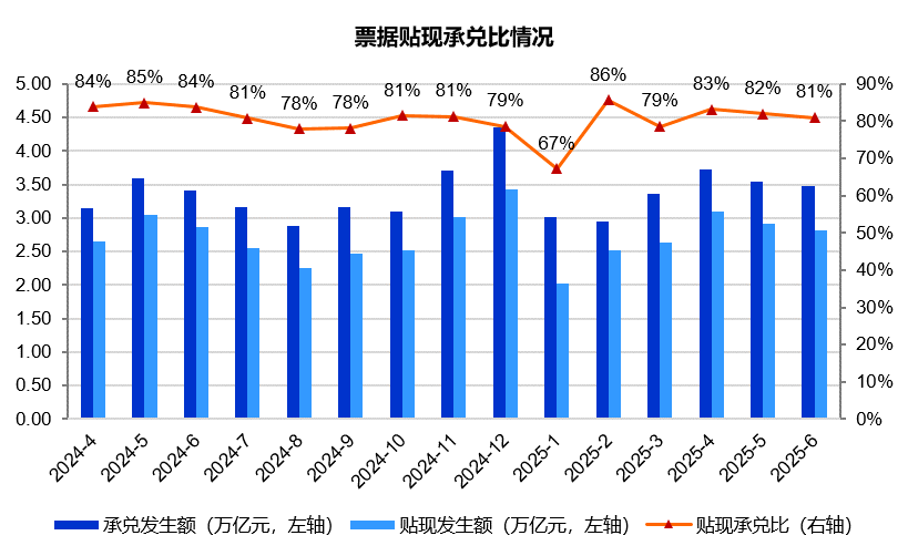 2025年6月,票据市场承兑发生额3.47万亿元,同比增长1.6%;贴现发生额2.81万亿元,同比下降1.8%。贴现承兑比为81%,低于去年同期的84%,依然处于较高水平,票据市场除月末外总体上依然是供不应求的状态。