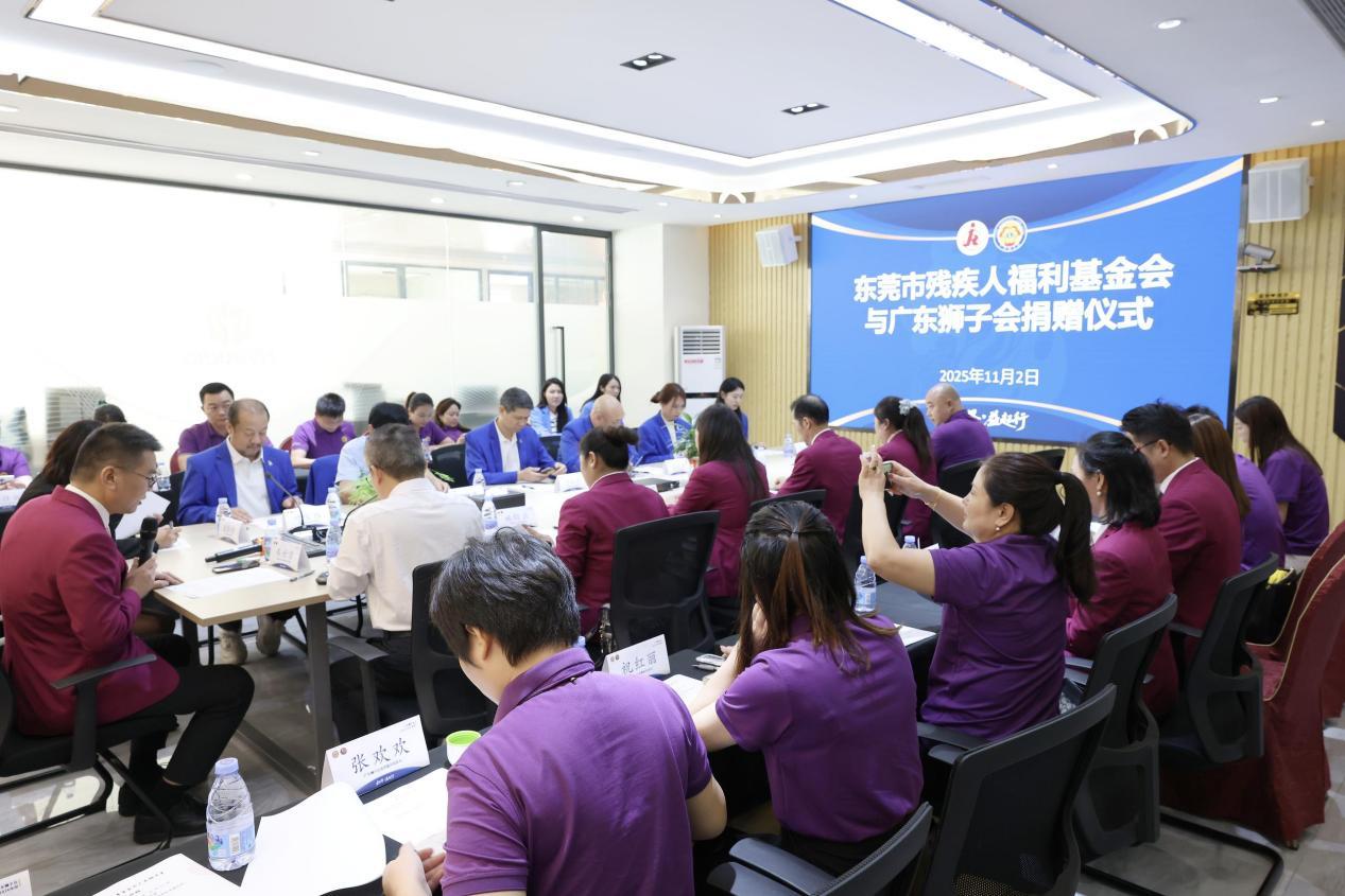 2025年11月2日上午,东莞市残疾人福利基金会与广东狮子会捐赠仪式在东城盈锋广场二楼会议室隆重举行。东莞市残疾人联合会三级调研员王锦绣,东莞市残疾人福利基金会理事长叶宝维、监事长许绍伟,广东狮子会会长陈世君,东莞代表处总监林锦云及双方代表齐聚一堂,共同见证这场凝聚爱心、助力公益的重要时刻。会议由东莞市残疾人福利基金会名誉会长、广东狮子会东莞代表处第二副总监车世富主持。